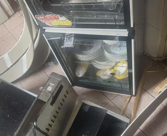 事后数日,当丈夫返回家中,眼前的景象仍令他心有余悸:抽油烟机被炸毁,柜门及板材等物品散落一地,现场一片狼藉。