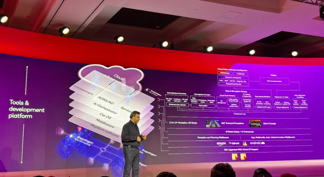 汽车端同样在进化。高通正在与各大汽车厂商一起,实现“AI上车”,用软件定义汽车。这次峰会现场,高通汽车产品路线图中的两款新品也一起亮相,一款是骁龙座舱至尊版平台(Snapdragon Cockpit Elite),另一款是骁龙Ride至尊版平台(Snapdragon Ride Elite)。