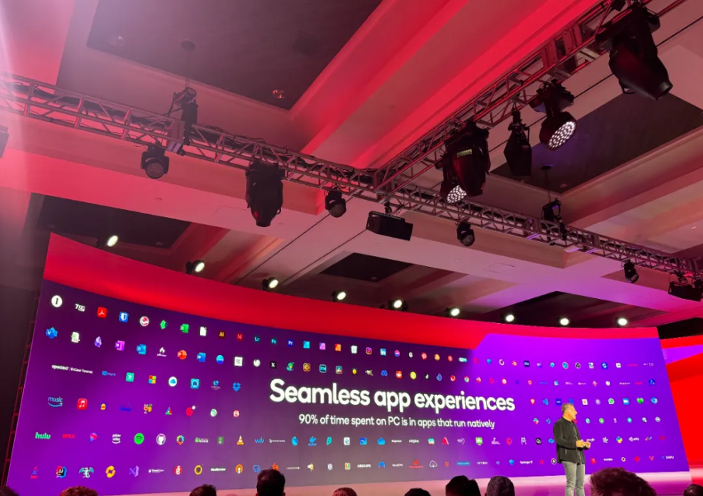 在PC端。高通与微软持续合作,扩展面向Copilot+PC产品的AI功能。高通指出,PC用户90%的时间所使用的应用,都能够在骁龙X系列上原生运行,无论是“AI原生应用”还是“转译运行的应用”。高通支持数百款原生应用程序,包括Chrome、Google Drive、Photoshop、Lightroom、Express、Nord VPNs、Whatsapp、Zoom、Slack和Spotify等。