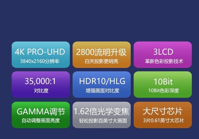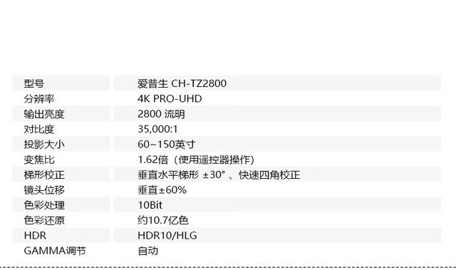 (中关村在线 四川行情)爱普生 CH-TZ2800是一款4K Pro-UHD全高清投影,2800流明(ISO标准)白色亮度/色彩亮度,35000:1高对比度,10-bit色彩深度,1.62倍变焦,支持水平垂直梯形校正。