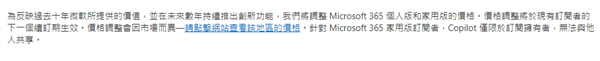 价格涨幅方面,以中国台湾为例,Microsoft 365个人版每月价格由219元新台币涨至309元新台币、每年价格从2190元新台币涨至3090元新台币,涨幅约41%。
