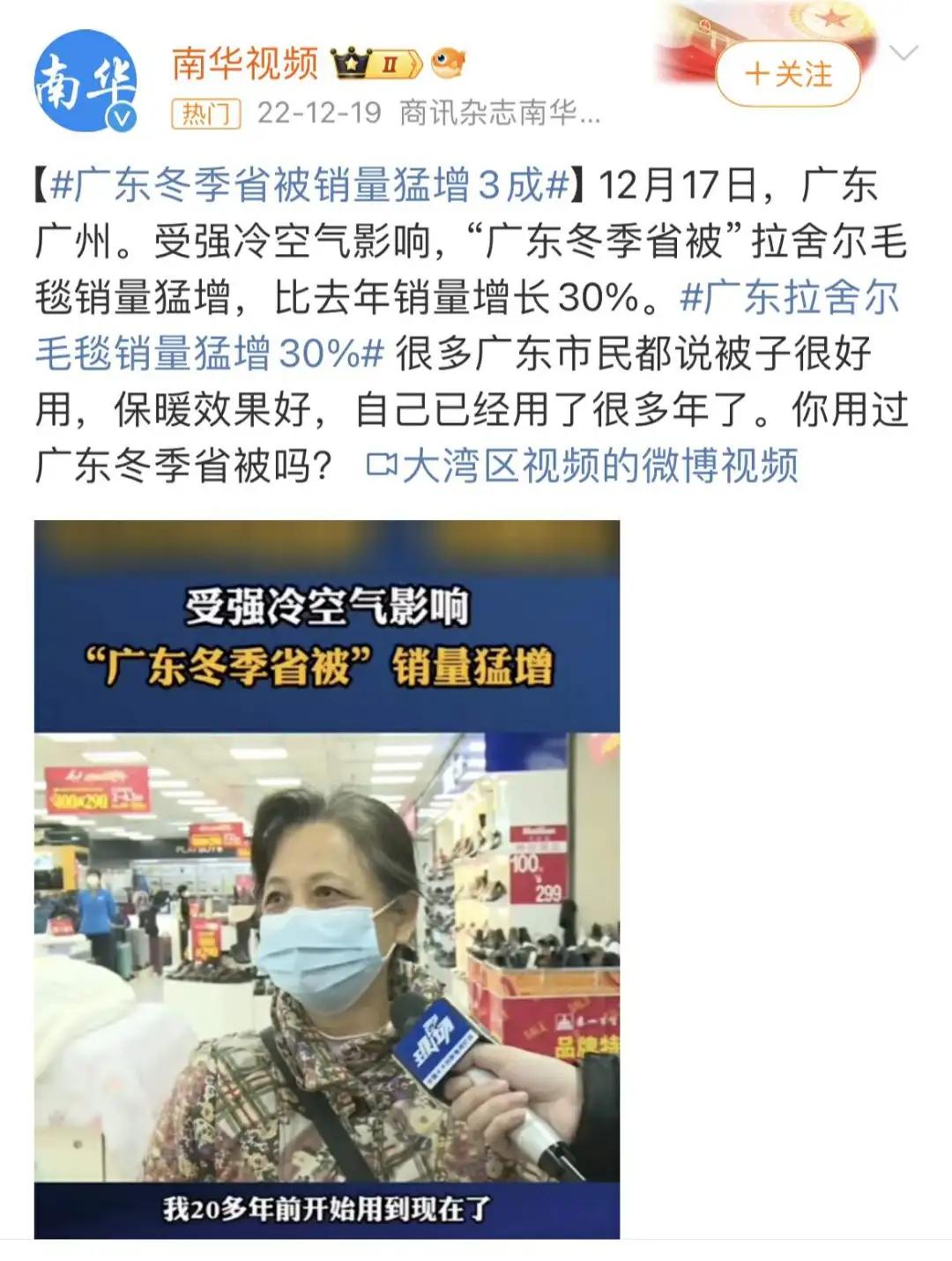 去年冬天时受强冷空气影响,“广东冬季省被销量猛增3成”热搜就触发了广东人的集体回忆:“家里有6斤和10斤的两张拉舍尔,每次大降温的时候,老爸就问今晚要几斤的。”