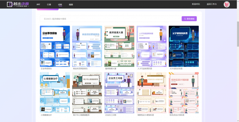秒出系列还出了动画,就是你常见到的一些动画人物讲解某个知识点这样的。与巨幕相同,它有着一个模板站,可以直接使用或者下载。