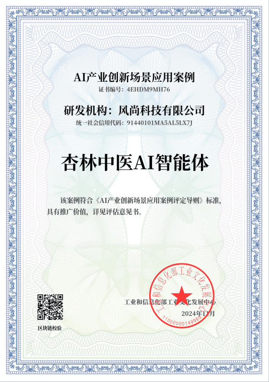 i黑马讯 近日,风尚科技有限公司的“杏林中医AI智能体”,经过工业和信息化部工业文化发展中心数字科技中心的严格评估,荣获“AI产业创新场景应用案例”认证。