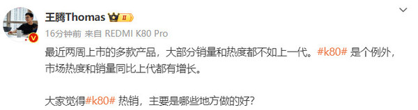 王腾:最近大部分新机销量和热度不如上代 K80是例外