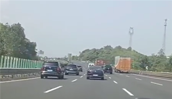 视频很简单,可以看到在一条多达5条车道(含应急车道)的高速公路上,有大约十几台竟然集体开得很慢,牢牢占据了所有的车道,并与右侧两辆大货车并行。