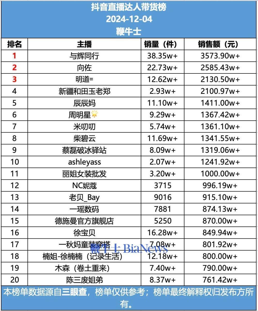 据鞭牛士每日发布的带货榜单,12月3日,向佐带货销售额为2655.56万元。