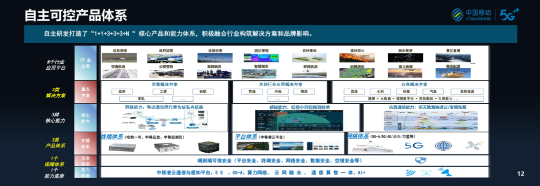 目前,中国移动已自主研发打造了“1+1+3+3+3+N”核心产品和能力体系,积极融合行业构筑解决方案和品牌影响。布局云、网、端产品,锻造差异化优势,中国移动自主研发了中移凌云、哈勃一号、中移应龙、空中信号测量仪等核心产品,开放能力对接大疆、中航工业等30余家头部品牌,涉及100多个主流机型。在智能网联能力、产学研团队、标准与专利核心卡位、行业生态整合能力等方面积累了先发优势。
