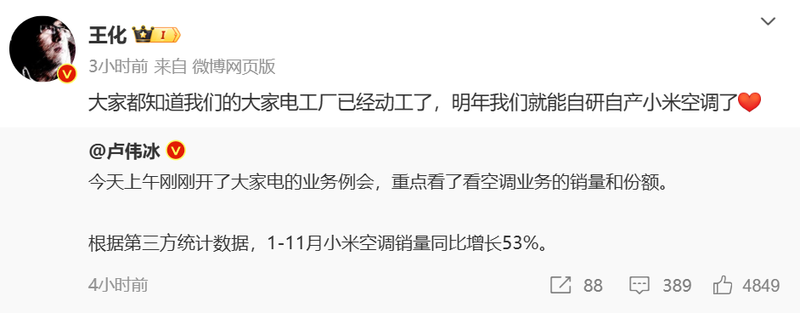 小米集团合伙人、总裁卢伟冰也微博发文疑似回应该事,他表示,“今天上午刚刚开了大家电的业务例会,重点看了看空调业务的销量和份额。根据第三方统计数据,1-11月小米空调销量同比增长53%。”王化转发这条微博时称:“大家都知道我们的大家电工厂已经动工了,明年我们就能自研自产小米空调了”。
