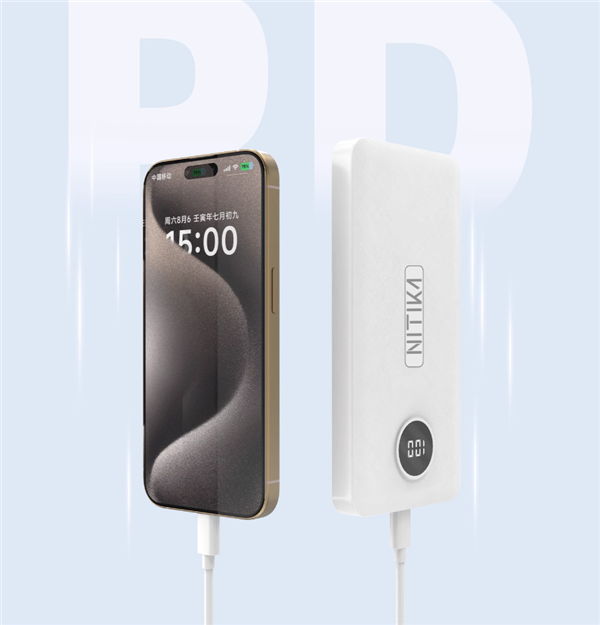 搭配20W快充充电器和5A数据线,约需2.5小时即可充满移动电源。为iPhone 15(10%电量)充电,30分钟可充满50%+。