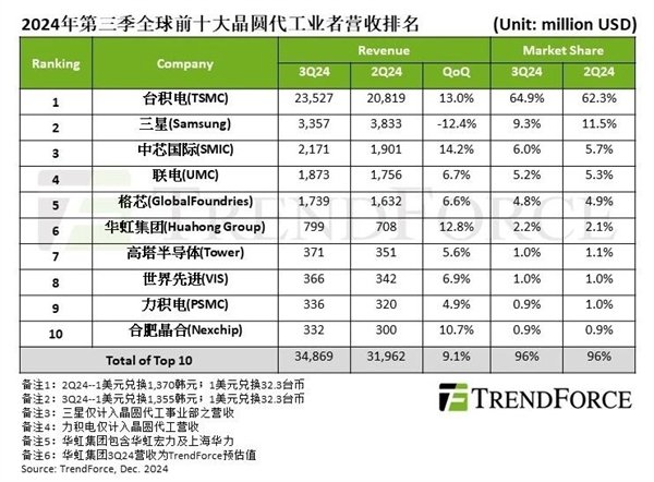 第三名中芯国际第三季季增0.3%,达6%市占率,逐渐逼近三星。