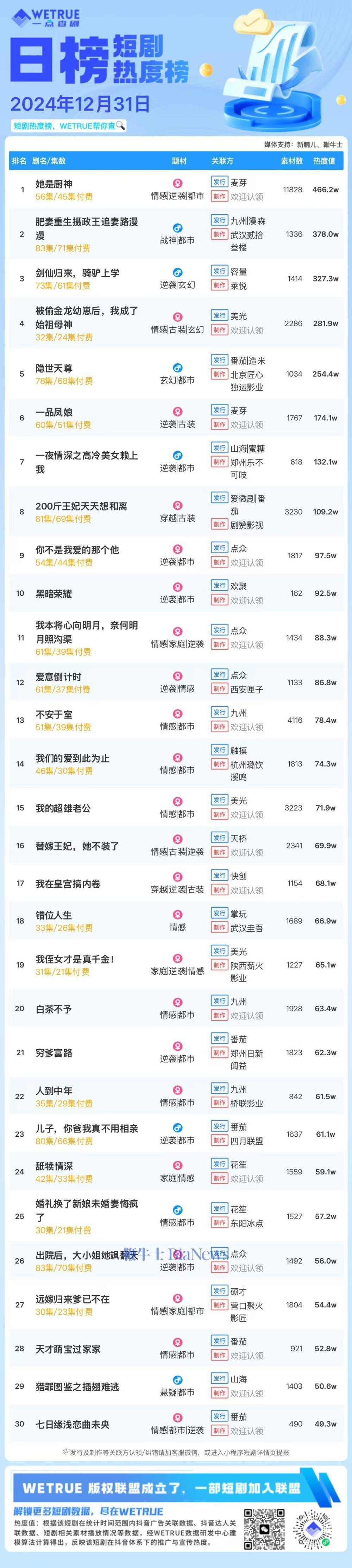 编者按:为帮助短剧从业者提供更多信息,专注于短剧报道的新腕儿和科技媒体鞭牛士联合WETRUE短剧热度榜共同推出短剧热度榜。