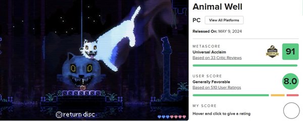 Eurogamer编辑盛赞《动物井》是这辈子梦寐以求的游戏,堪称艺术精品,一款简单却绝不平凡的银河城类探索游戏。借用玩家的评论便是:玩的时候觉得自己是天才,玩完了发现作者是天才。