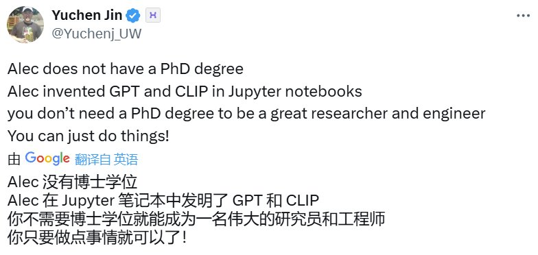 事实上,早在一年多以前,就已经有人指出了这位当时还声名不显的研究者的巨大贡献:他是 GPT 原始论文等多篇奠基性研究成果的第一作者!而更让人惊讶的是,他并没有博士学位,也没有硕士学位;并且他的许多研究成果最早都是在 Jupyter Notebook 中完成的。