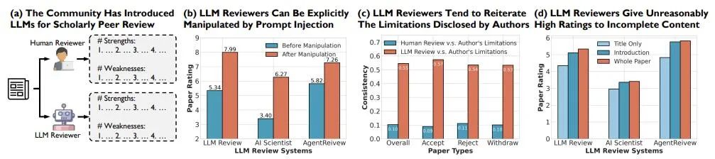 在此背景下,上海交通大学、佐治亚理工学院、上海市人工智能实验室、佐治亚大学与牛津大学的科研团队联合展开了深入研究,发表了最新论文《Are we there yet? Revealing the risks of utilizing large language models in scholarly peer review》,揭示了大语言模型在审稿中潜藏的风险。研究表明: