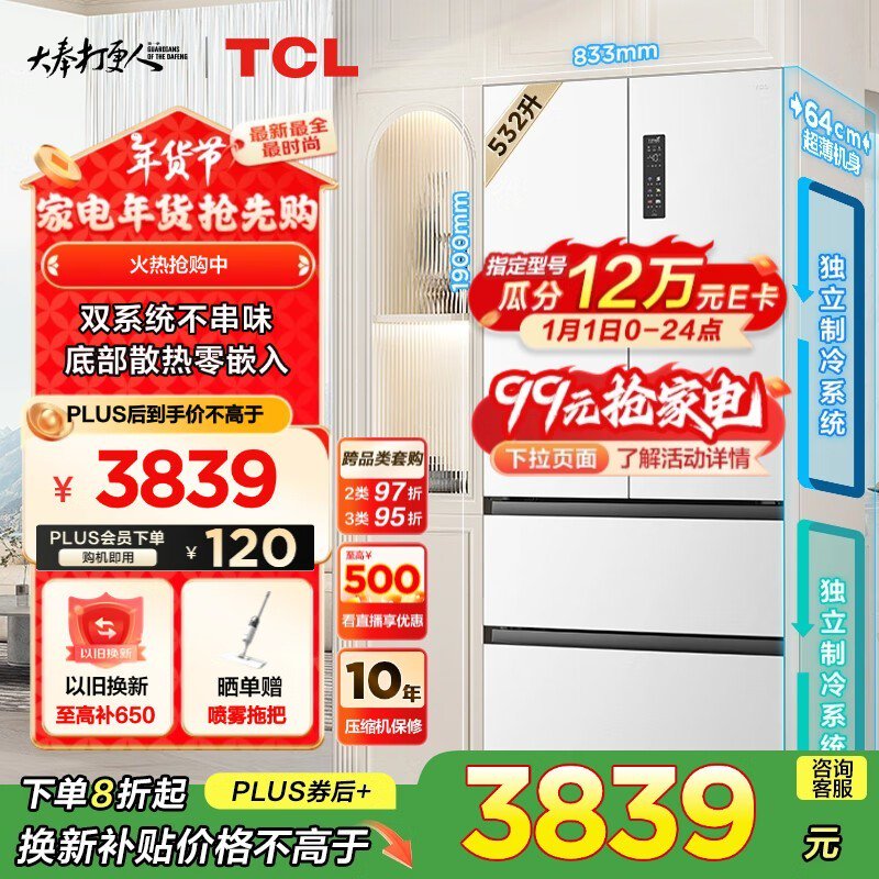TCL T9 Pro双系统双循环超薄零嵌四门冰箱2612元