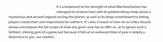 媒体指出,这部由MachineGames打造的冒险巨作,以探索神秘古老传说为核心,不仅带来了无与伦比的环球冒险,还给予玩家自由创造乐趣的机会。它的成功不仅是对游戏设计的最好诠释,也是对游戏评论界的一次提醒:每一年的游戏盘点都应全面覆盖,而不应因为发布时间的“太晚”而忽视一颗耀眼的宝石。