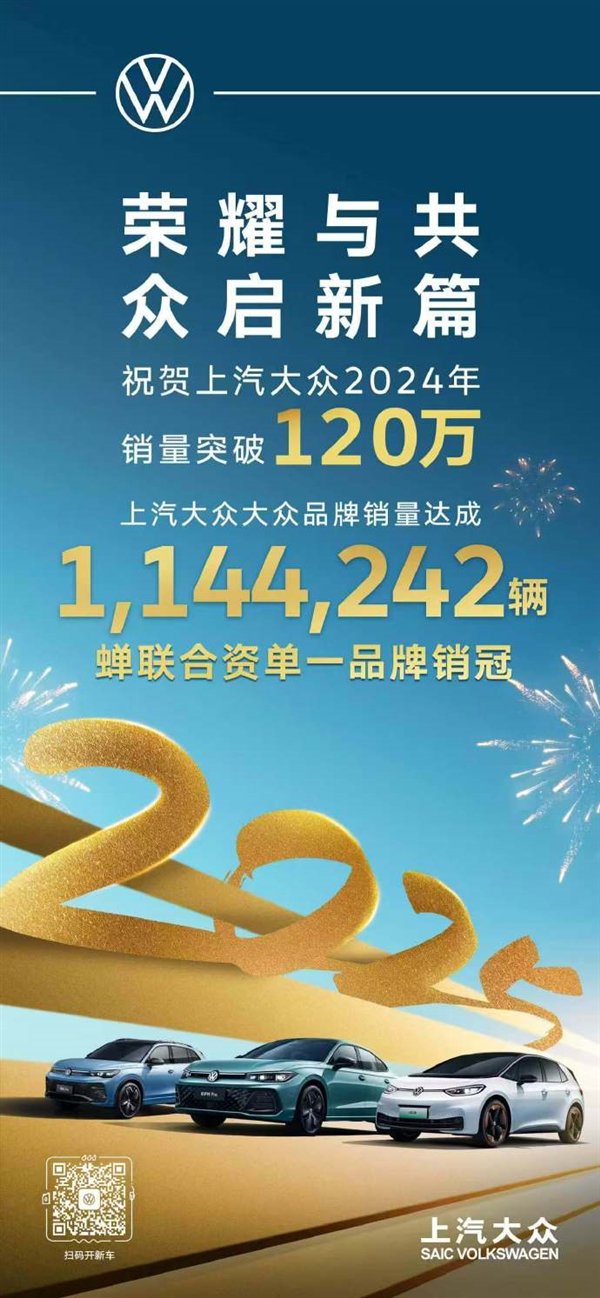 快科技1月1日消息,上汽大众在2024年的销量成功突破120万辆,其中大众品牌的销量超过114万辆,连续多年蝉联合资单一品牌销量冠军。