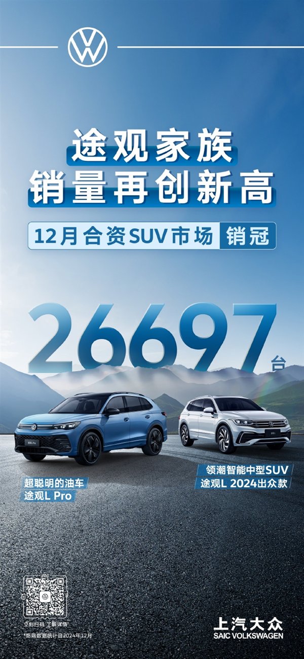 途观家族12月销量达到26697辆;朗逸家族12月销量突破3.9万辆;