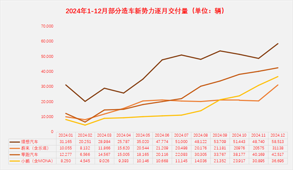 在2024年连续12月稳居单月交付榜首的理想汽车,毫无悬念的以全年超50万辆的表现拔得头筹;从去年8月开始爆发的零跑汽车,凭借全年近30万辆的累计销量位居“榜眼”;在2024年最后一个月首破单月交付3万辆的蔚来,力压小鹏夺得“探花”;去年上半年表现疲弱的小鹏位列第四。