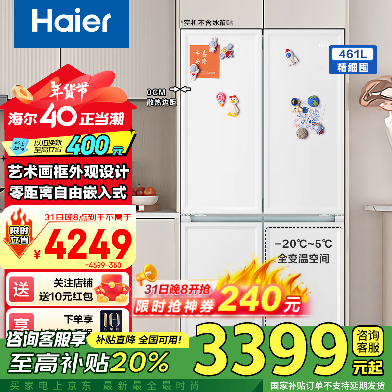 海尔461升零距离嵌入式冰箱仅3197元!节能又环保