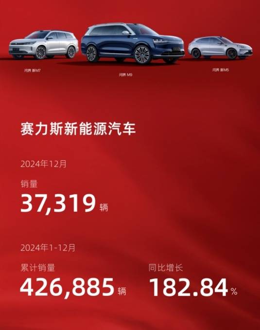 2025年1月1日,赛力斯发布2024年12月产销快报。数据显示,赛力斯12月新能源汽车销量达37319辆;1-12月新能源汽车累计销量达426885辆,同比增长182.84%。