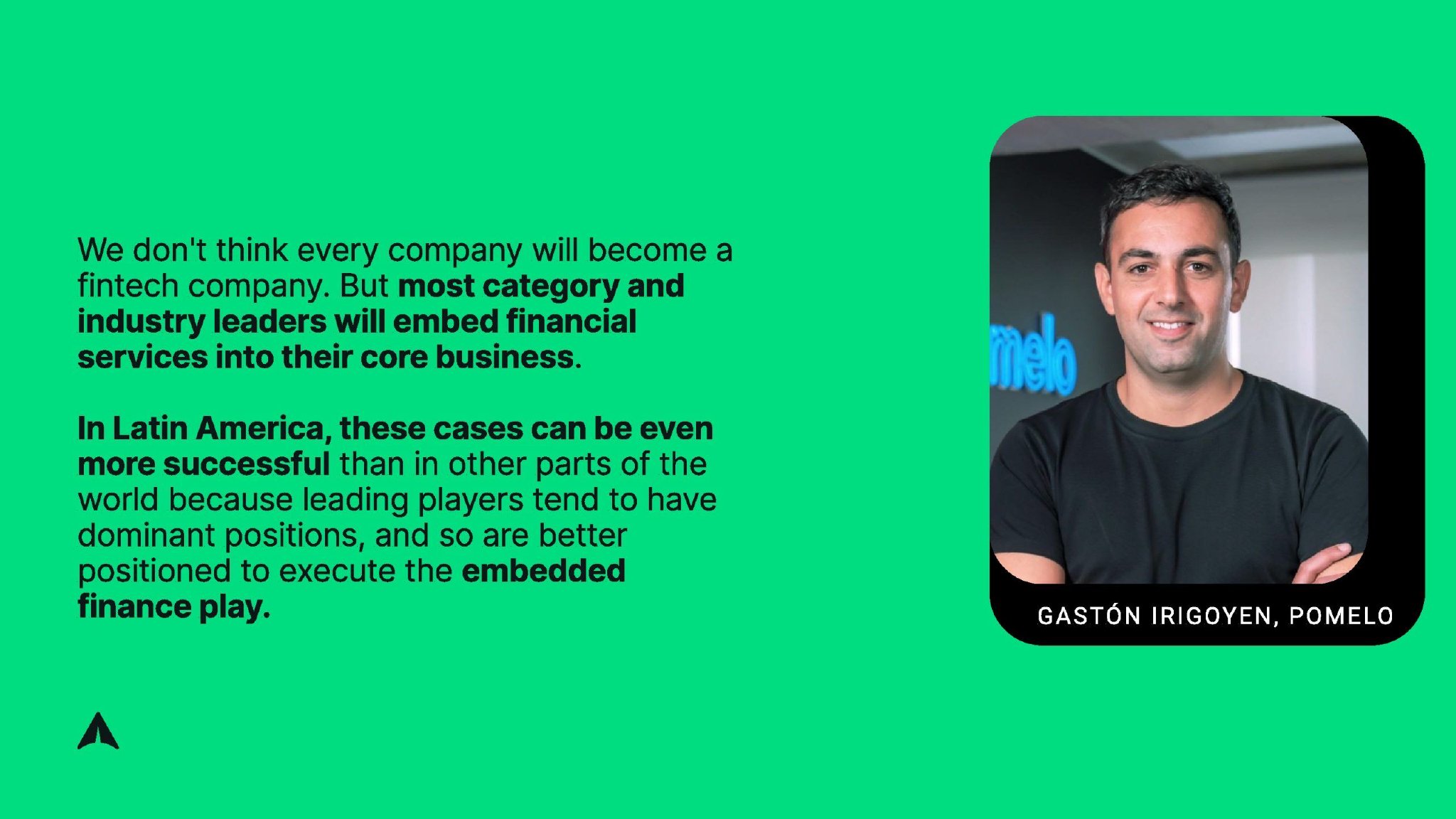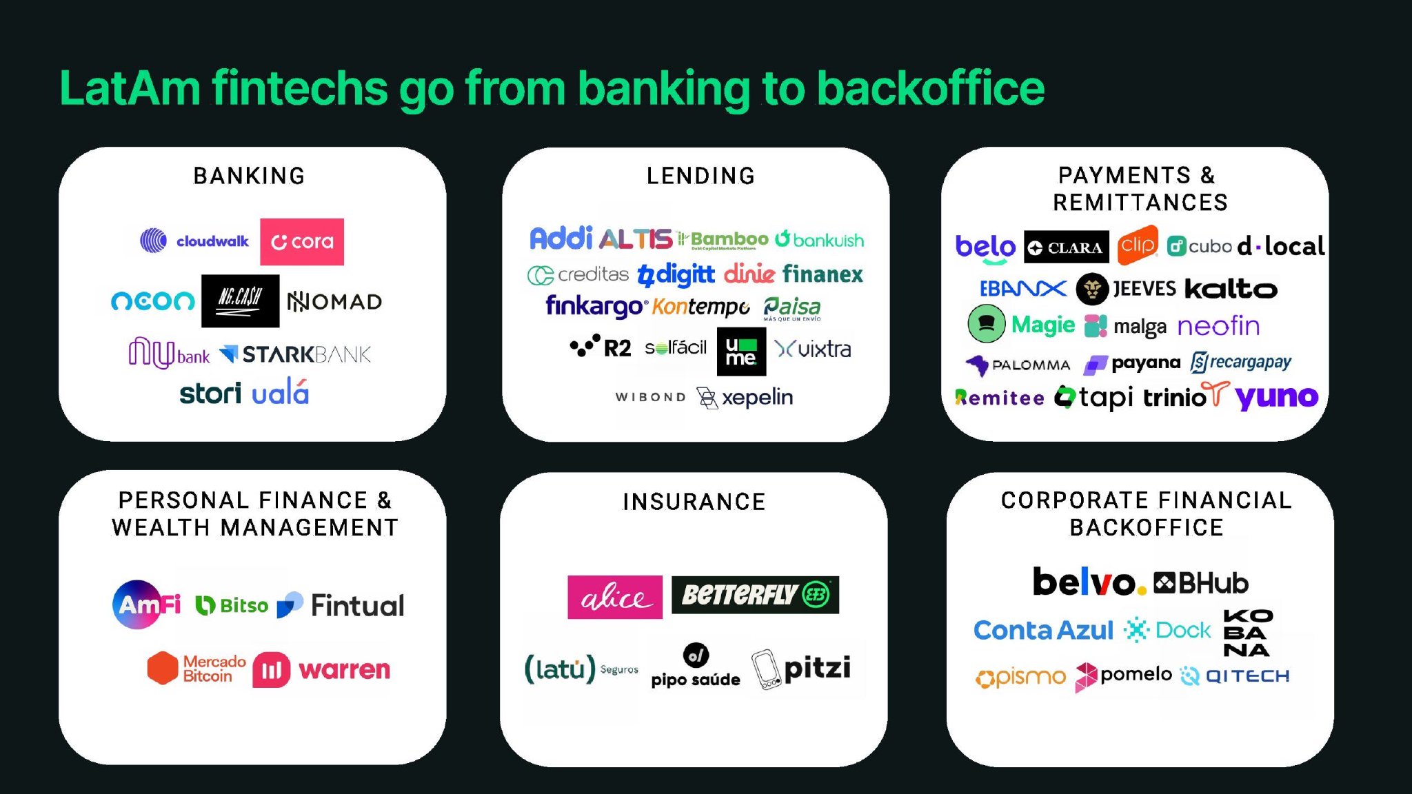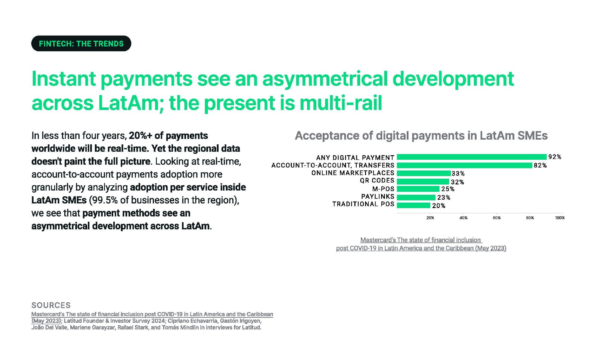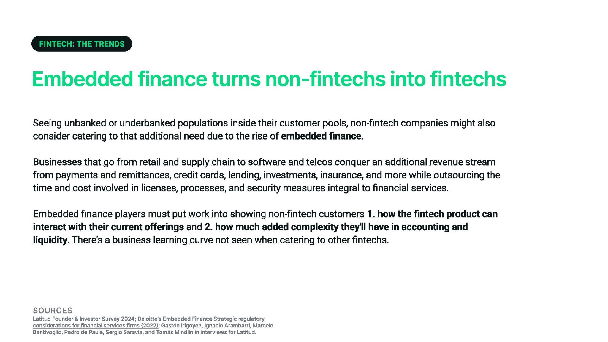 从银行到支付和汇款,从行为到监管:我们看到的主要趋势是整个拉丁美洲金融的不对称发展。但在通过嵌入式金融、构建多产品解决方案、以瓦特萨普为突破口、以及越来越多地采用人工智能等方式将金融科技引入非金融科技公司方面,也存在地区共性。