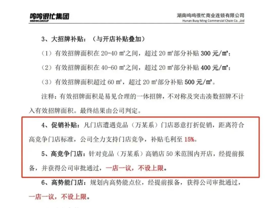 今年6月,将名字从“零食很忙”更改为“鸣鸣很忙”的鸣鸣很忙宣布全国门店总数突破10000家,先万辰集团一步拿到了万店入场券。此前,鸣鸣很忙集团的加盟政策曾明确写出,凡门店遭遇竞品(万某系)门店恶意打折促销,只要符合高竞争门店标准,公司全力支持门店竞争,补贴毛利至15%。