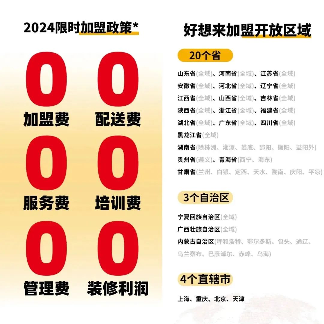 来优品加盟政策还可以从好想来此前曾亮出的“6个‘0’政策”可见一斑。6个0即对加盟商采取0加盟费、0管理费、0配送费、0培训费、0服务费、0装修费,加盟条件是需要启动资金约60万元(以150㎡为例预估费用),门店至少150㎡的空间、至少12m的门头。