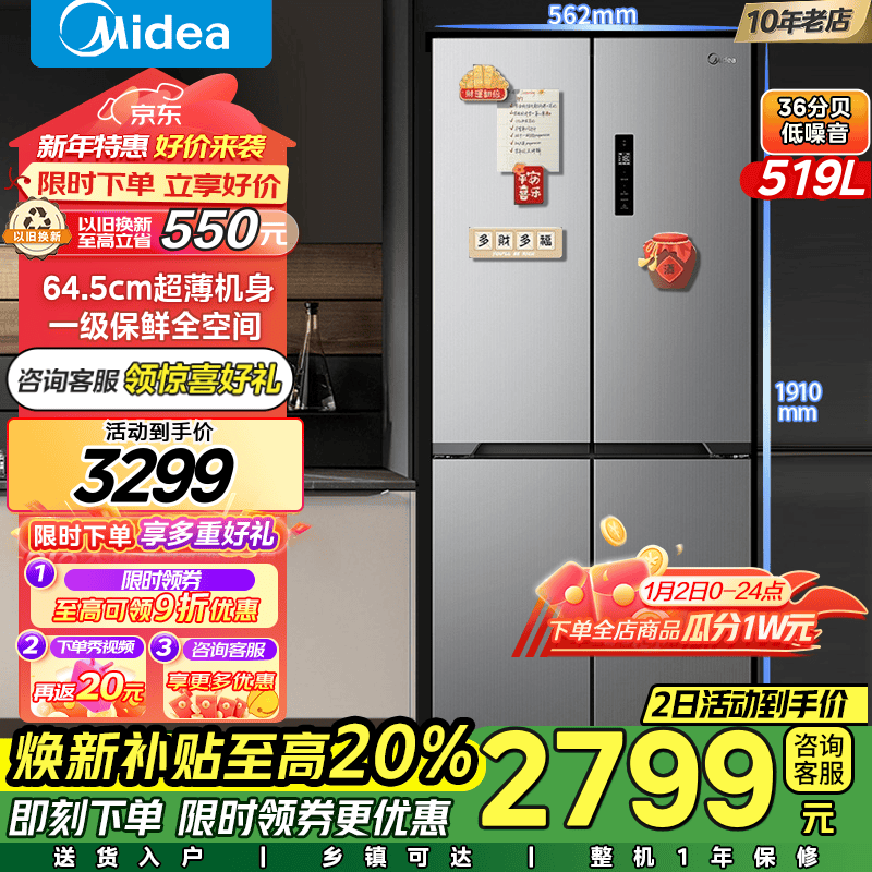 美的MR-545WSPZE十字对开门冰箱,大容量智能家电,适合家庭使用