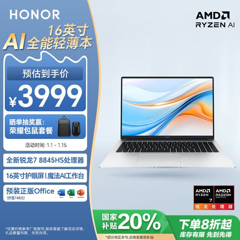 荣耀 X16 Plus 2024款八代锐龙版轻薄笔记本电脑 限时优惠3359元