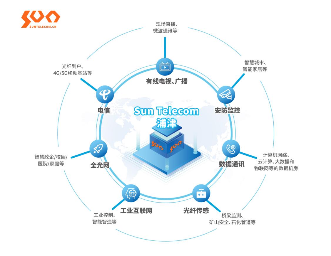 “Sun Telecom 浦津”是一家“光纤整体解决方案”提供商,客户遍布130多个国家和地区。公司以“最大程度满足客户需求”为服务宗旨,为全球客户提供“系统性、定制化、端到端、一站式”的光纤整体解决方案和产品,涉及领域包括电信(光纤到户、4G/5G移动基站等)、有线电视和广播、安防监控(智慧城市、智能家居等)、计算机网络、数据机房(云计算、大数据和物联网等)、政企/校园/医院/家庭全光网、工业互联网(工业控制、智能制造等)和光纤传感等。