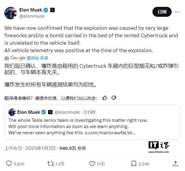 IT之家注意到,特斯拉首席执行官埃隆・马斯克声称,此次爆炸与 Cybertruck 本身无关。他在 X 平台上发文称,公司已远程访问了该特定 Cybertruck 的数据,以证明爆炸并非车辆故障所致。“我们现已确认,爆炸是由该租赁 Cybertruck 的后车厢携带的大型烟花和 / 或炸弹引起的,与车辆本身无关,”他写道。马斯克还表示,“执法部门目前认为(爆炸)极有可能是故意的。”