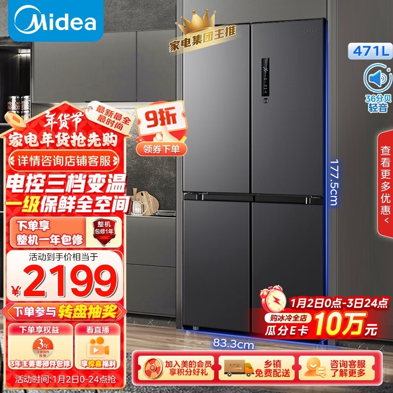 美的471升十字对开四开门电冰箱 节能环保智能便利