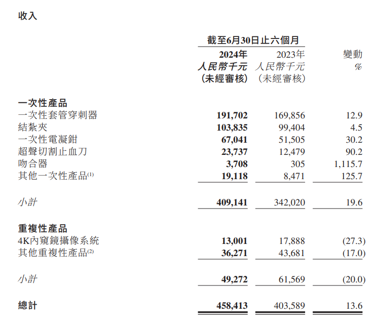 2024年上半年,康基医疗产生收入4.58亿元,其中4.09亿元来自于一次性产品,包括一次性套管穿刺器、结扎夹、一次性电凝钳、超声切割止血刀等。另外的0.49亿元来自于重复性产品,包括4K内窥镜摄像系统、其他重复性产品。
