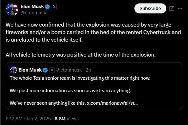 马斯克在社媒平台发帖称,特斯拉已证实拉斯维加斯特朗普酒店外一辆Cybertruck爆炸是由非常大的烟花和/或放置在车底的炸弹引起的,与车辆本身无关。