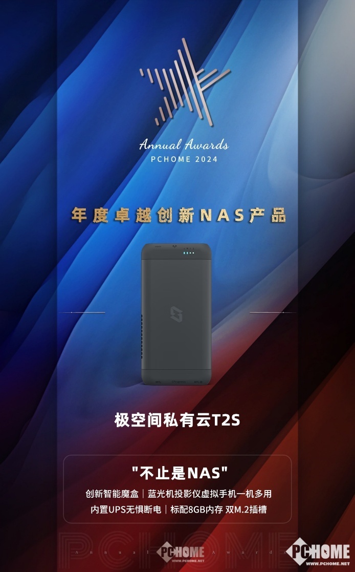 极空间T2S不仅延续了极空间私有云广受好评的易用、智慧、安全等NAS功能,而且具有小巧便携、多接口、多功能、多场景化的独创特征,在PChome2024年度科技产品评选活动中,极空间T2S获得年度卓越创新NAS产品奖项。