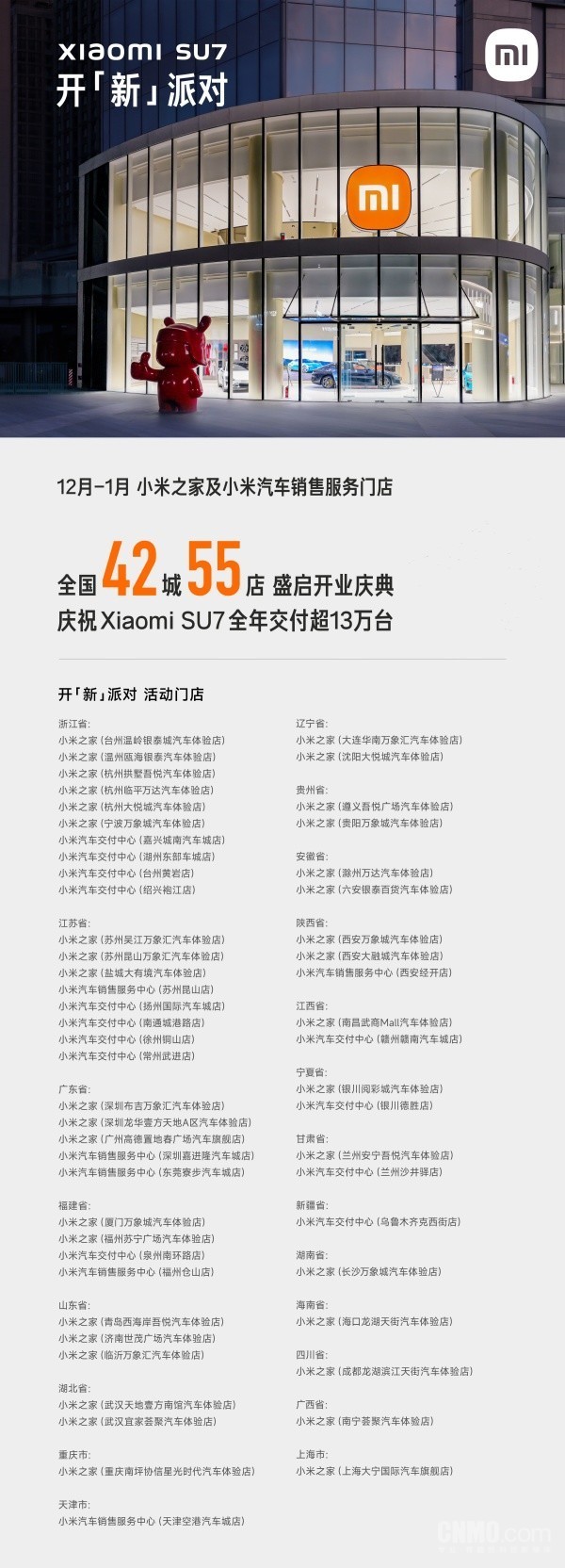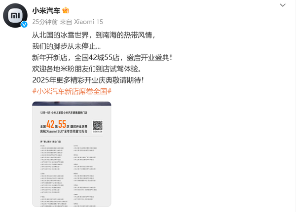 【CNMO科技消息】从北国的冰雪世界,到南海的热带风情,小米汽车的脚步从未停止。1月2日,小米汽车官方宣布,12月-1月,小米之家及小米汽车销售服务门店全国42城55店盛启开业盛典,庆祝小米SU7全年交付超13万台。“欢迎各地米粉朋友们到店试驾体验,2025年更多精彩开业庆典敬请期待”。