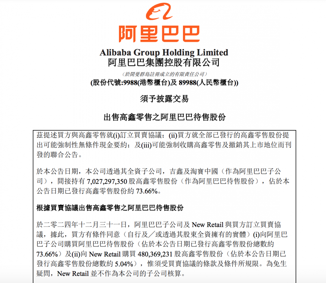 昨日晚间,阿里巴巴集团发布公告,宣布子公司及New Retail与德弘资本达成交易,以最高约131.38亿港元(约合人民币123.5亿元)出售所持高鑫零售全部股权,合计占高鑫零售已发行股份的78.7%。