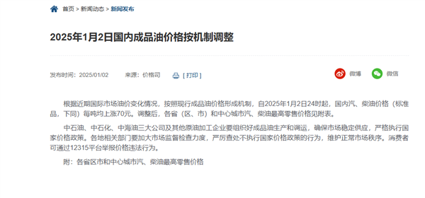 快科技1月2日消息,据国家发展改革委网站,新一轮成品油调价窗口将于今天24时开启,成品油价迎来2025年的首次调整。
