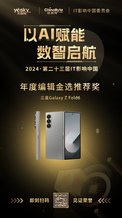 【天极网手机频道】「IT影响中国」自2002年创办以来,始终关注中国IT科技消费热点与科技行业年度风云变化,深入挖掘行业创新价值、倾听消费者心声、聚合业内优质资源,与业界精英,评选表彰那些表现突出、引领潮流的科技产品、企业及先锋人物,旨在挖掘科技创新优势,展示行业在数智化变革中所取得的成就,见证科技进步力量。日前,2024年第二十三届IT影响中国奖项正式公布,三星Galaxy Z Fold6凭借着时尚轻巧的设计、沉浸高效的大屏、坚固耐用的机身、独特好玩的交互、出色稳定的性能、强大智慧的影像以及丰富有趣的AI功能,荣获IT影响中国2024年度编辑金选推荐奖。