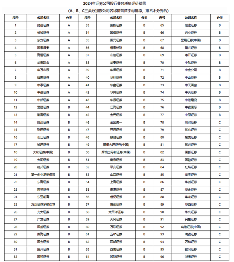 此外,2024年有19家券商该评级为C类,占比近两成。其中,川财证券、东北证券、国都证券、国融证券、红塔证券、华创证券、华金证券和华西证券已经连续两年被列入C类名单。