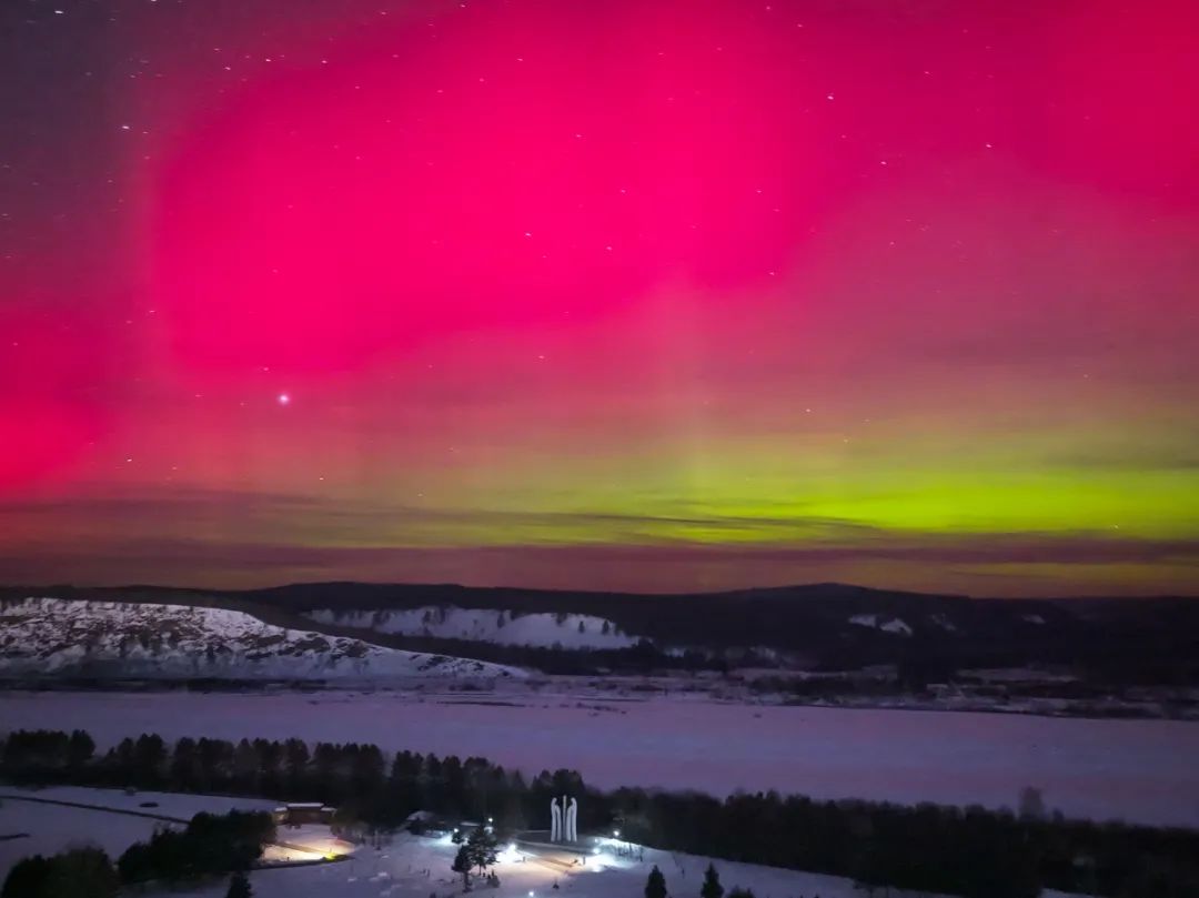 受地磁暴影响,黑龙江漠河出现绚丽的极光美景。在漠河北极村,通过肉眼可以看到绿色、红色、紫色的极光在夜空中交相舞动。此次的极光当中绿色光带占比更大,而且极光持续时间更长。