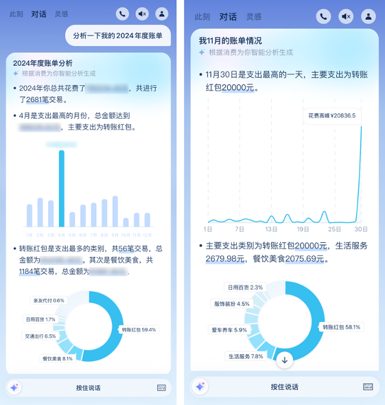 但是支小宝并没有使用固定的 H5 模版,而选择在获得用户授权后,让 AI 基于其支付宝账单数据进行提炼生成。用户只需要在支付宝首页下拉或下载支小宝 App,就能收到一份 AI 为自己「量身」生成的独特年度总结。
