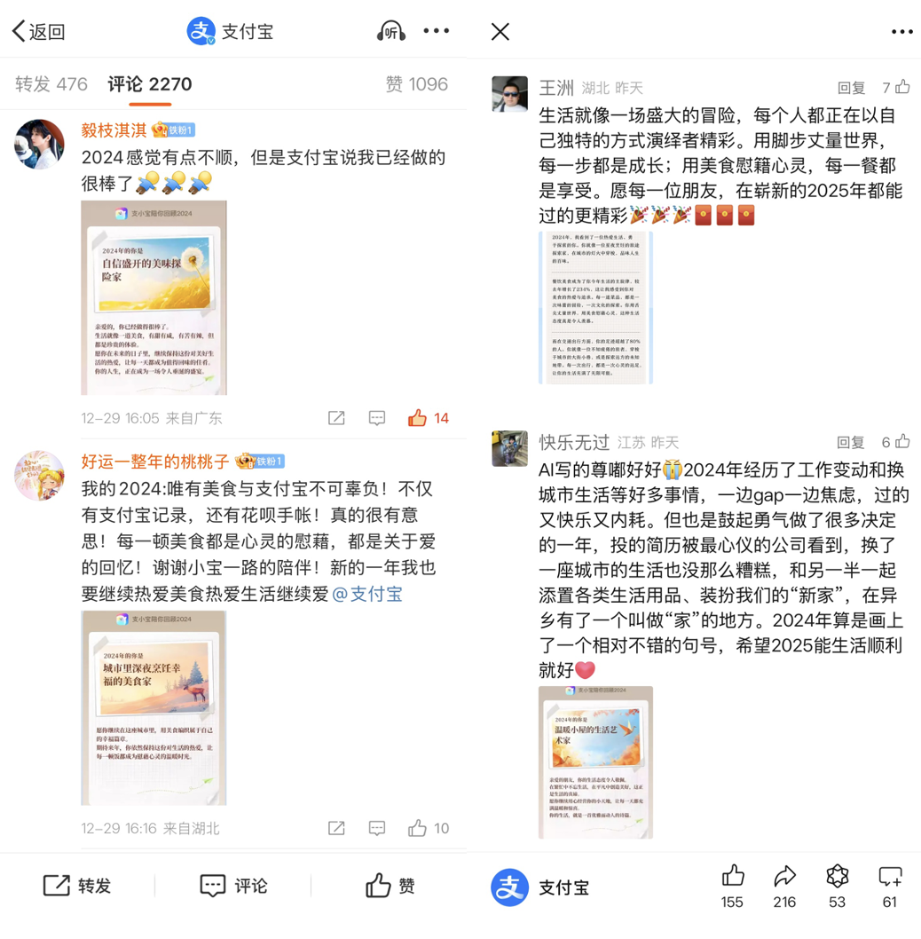 还有网友留言:「2024 感觉有点不顺,但是支付宝说我已经做的很棒了!」