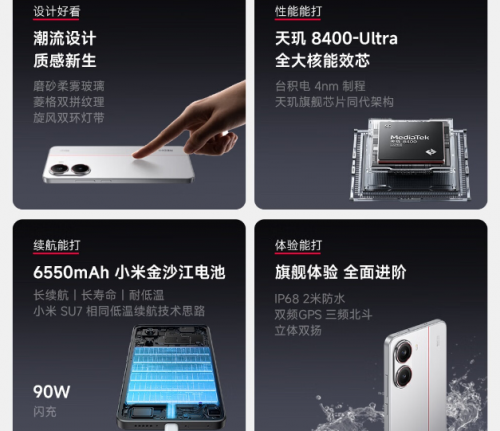 REDMI Turbo 4搭载天玑8400-Ultra,配置狂暴引擎,性能无忧,游戏体验好;带来AI游戏网络时延预测,游戏延迟更低,还带来全新定制UI界面,开关更便捷。续航方面,REDMI Turbo 4内置6550mAh小米金沙江电池,实现四年耐用,续航无忧;同时搭载双增压耐寒芯片,提升低温场景电芯可用容量;体系化重构整机热管理系统,回收系统余热,超低温下电池快速升温。此外,REDMI Turbo 4还采用旗舰金刚架构,支持IP68 2米防水,更耐用;支持湿手触控2.0,更好用;支持双频GPS、三频北斗,快速定位,精准导航。