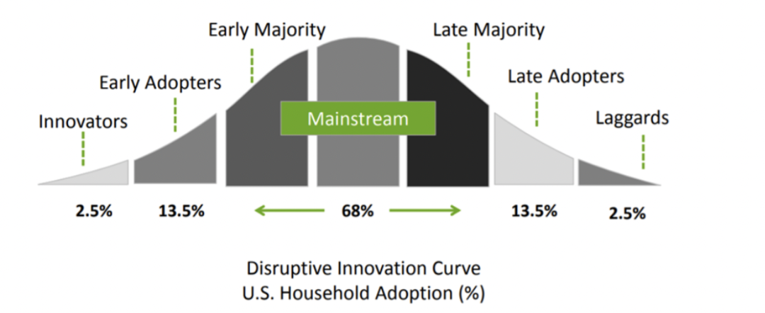 其实仔细一推算也应当是如此,一款因为技术进步创造出的全新需求产品在大众中普及,大约会分为如下几个阶段:先是占总人群约2.5%的技术狂热者接触这项产品;紧接着,随着技术进步、产品更加好用,会吸引到占总人群约13.5%的早期用户;而后,随着技术越来越进步、产品越来越好用,产品在用户中的渗透率会逐渐增加,规模效应又会使得相应产品成本下降,从而价格下降,致使产品渗透率进一步增长,最终完成所有用户的普及。