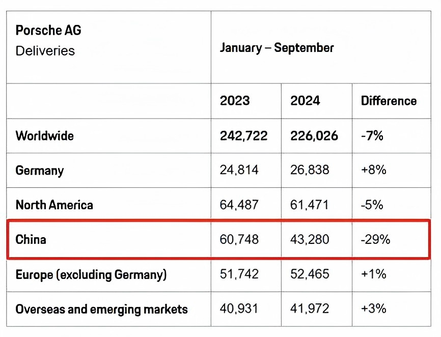 数据显示,2024年前三季度,保时捷全球销量下降7%,交付22.6万辆汽车,其中最大的下降就来自中国市场。期间,保时捷在中国累计交付4.33万辆汽车,较去年同期的6.1万辆暴跌了29%。甚至有网友戏称,抄了保时捷的山寨保时捷(小米),干倒了保时捷。