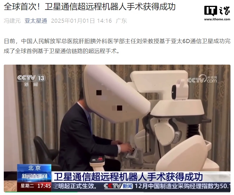1 月 2 日消息,据亚太卫星宽带通信(深圳)有限公司 1 月 1 日消息,日前,中国人民解放军总医院肝胆胰外科医学部主任刘荣教授基于亚太 6D 通信卫星成功完成了全球首例基于卫星通信链路的超远程手术。