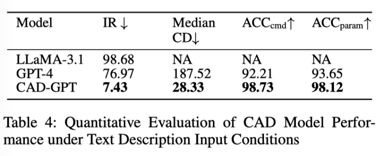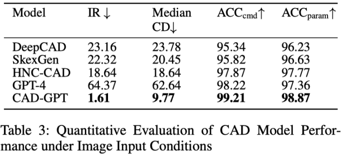 将 CAD-GPT 与三种代表性方法进行了比较。第一个是 DeepCAD,它演示了 CAD 建模中的先进生成技术。第二个是 GPT-4,代表了闭源多模态大型模型的前沿。第三个是 Qwen2-VL-Max,这是领先的开源多模态大型模型之一。相比之下,CAD-GPT 产生的输出既准确又美观。